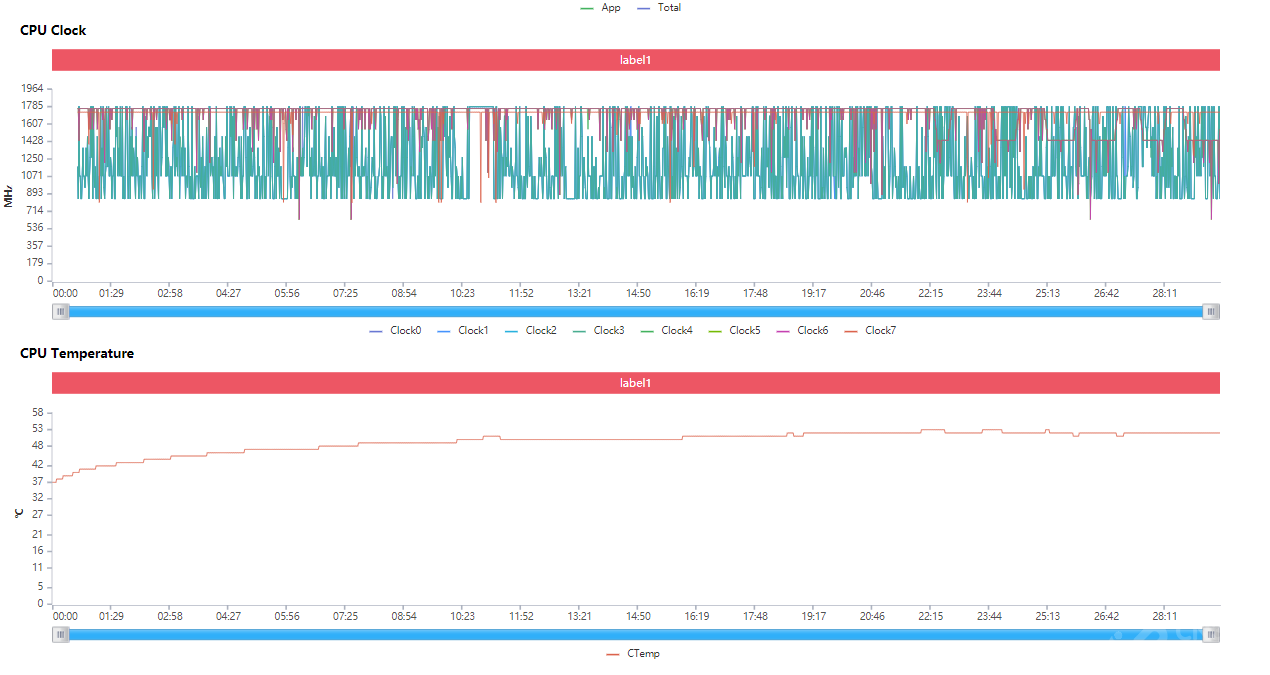我们完全可以看一下大核主频的变化,前期2054MHz本来就没达到应有的水准,后期更是急转直下,运行的频率只有接近1500MHz的水准。