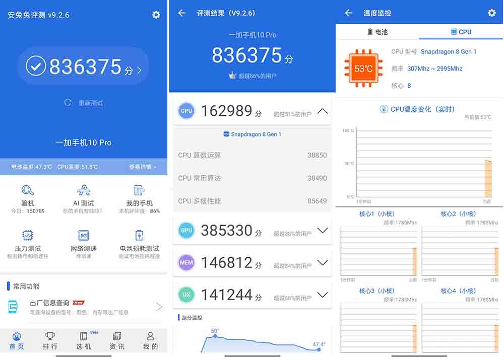 一加10 Pro的得分下降得更厉害,CPU只剩下16万分出头,其余三项也或多或少有所下降,证明其大核性能完全被腰斩。具体可以关注CPU算数运算和常用算法这两项,这是CPU单核性能检测,或者说手机在处理日常应用任务的时候最需要的性能,一加10 Pro仅有38850和38490;多核得分也略有下降,85649应该就是大核锁频的影响。CPU温度可以到55℃左右,截图时已经降到了53℃。