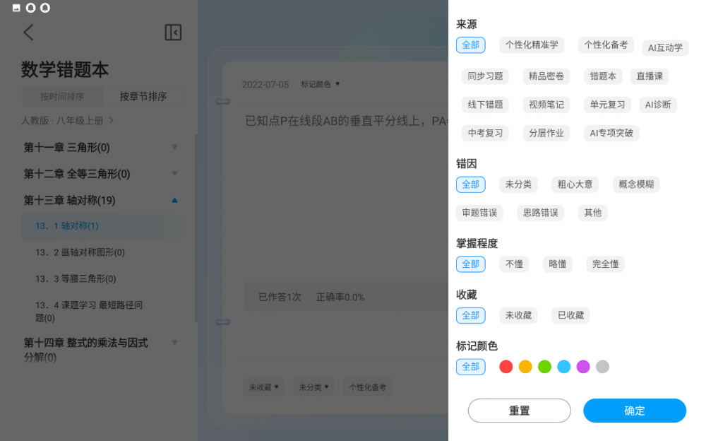 科大讯飞AI学习机T10上的AI全科错题本,将T10上有教学内容的11个科目错题进行汇总,这是传统方式无法比拟的。在错题本中,我们不仅能够按照错题的类型、错误的原因、掌握程度来进行分类,并且可以对每种错题进行颜色标记,这能够让孩子们更主动的去学习理解错题。并且在错题本左侧,也会按照知识点的类型进行分类,方便孩子针对性的提高。