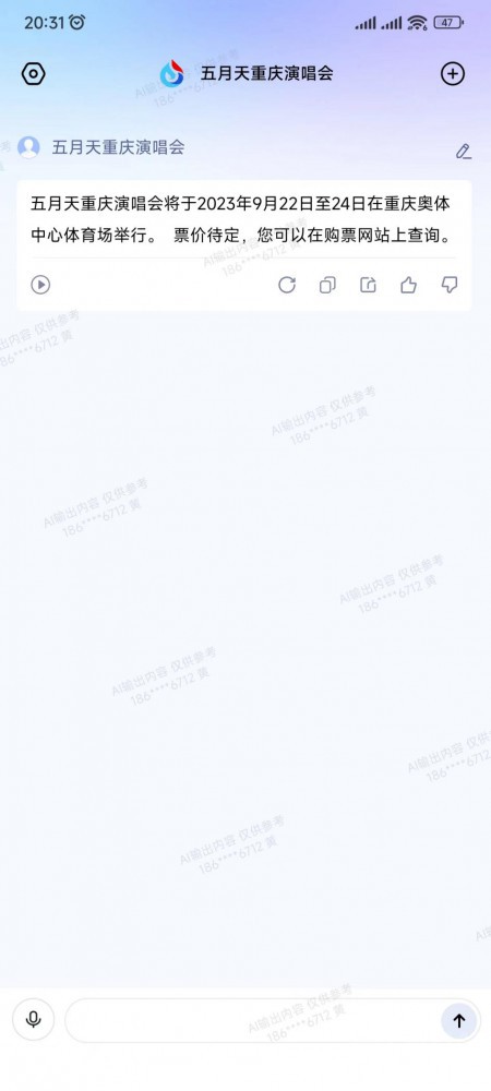 在基础能力上,讯飞星火认知大模型正如普通人对类似工具形成的初期印象那般,提供了实时搜索能力。在聊天框中,用户可以任意输入当前你想知道的问题,比如五月天要在重庆举办演唱会,我想知道什么举办,是否开启购票了。就此问了一番讯飞星火,得到的信息与目前网络上的公开消息是相符的。