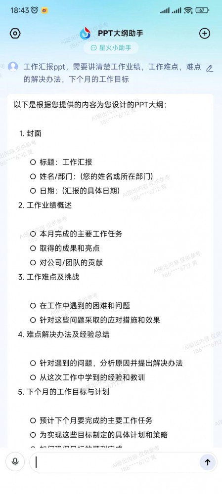 对于没有系统性地学习过PPT的人来说,要想制作一份没有遗漏的PPT,可能并不是那么容易,尤其是在制作中还需要考虑排版。在讯飞星火职场场景下提供了PPT大纲助手,可根据用户的关键词生成PPT大纲,用户依葫芦画瓢即可。