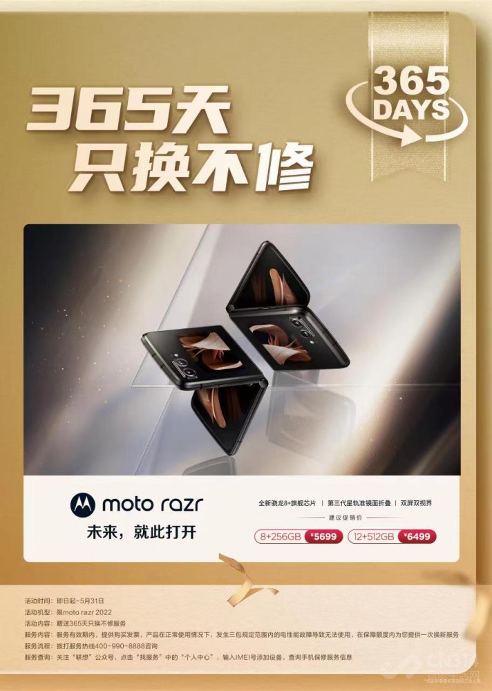 从即日起到5月31日,moto razr 2022都可以享受365天只换不修的限时优惠。这意味着在服务有效期内,正常使用,且在三包范围内的电性能故障让手机无法使用,在联想手机线下门店、联想来酷智生活等线下渠道都可以享受到在保障额度内的一次只换不修服务。也就是说,如果你手机符合这些条件,可以直接只换不修,当年iPhone能只换不修时期的尊贵享受好像又回来了!