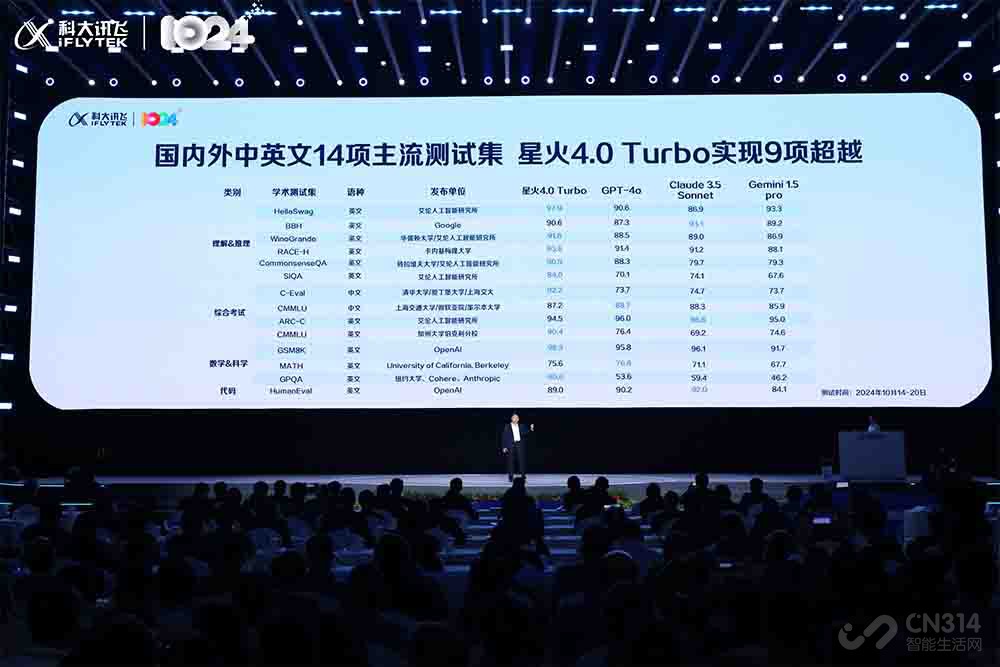 【CN314智能生活】大模型应用7项第一!10月24日,第七届世界声博会暨2024科大讯飞全球1024开发者节开幕上,科大讯飞董事长刘庆峰公布讯飞星火大模型应用成绩单,并发布星火4.0Turbo:七大核心能力全面超过GPT-4 Turbo,数学和代码能力超越GPT-4o,国内外中英文14项主流测试集中讯飞星火4.0Turbo实现9项第一。与此同时,国产超大规模智算平台“飞星二号”正式启动。